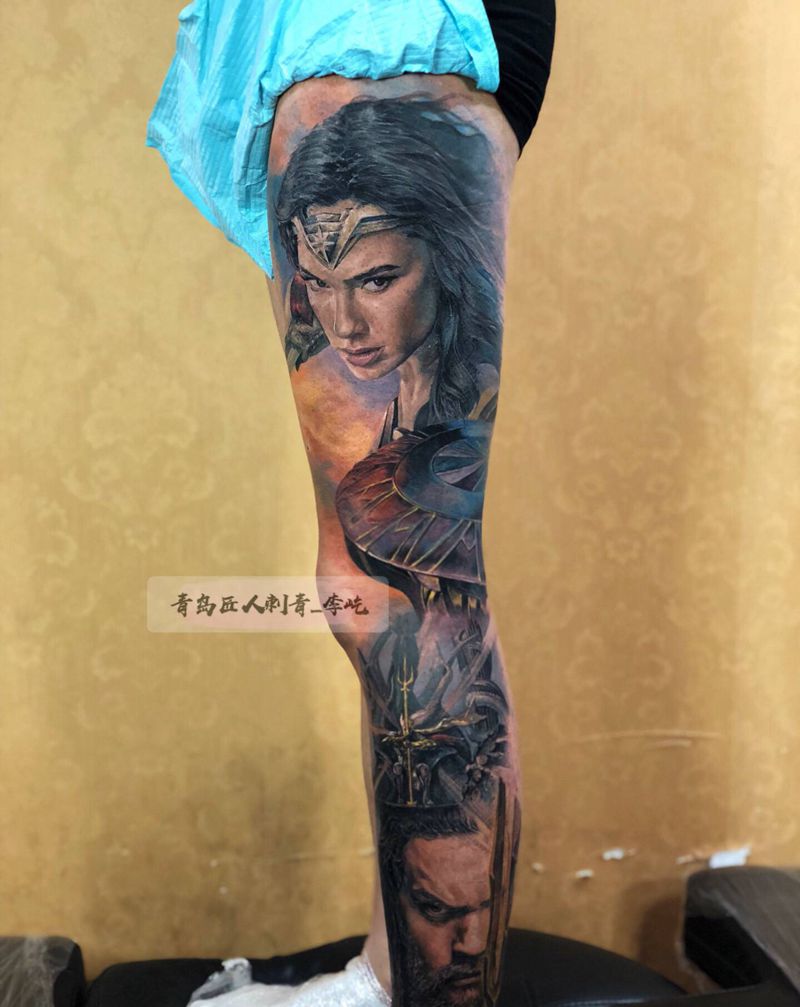 dc题材花腿 彩色纹身图片_腿部新传统欧美写实神奇女侠dc海王纹身图案