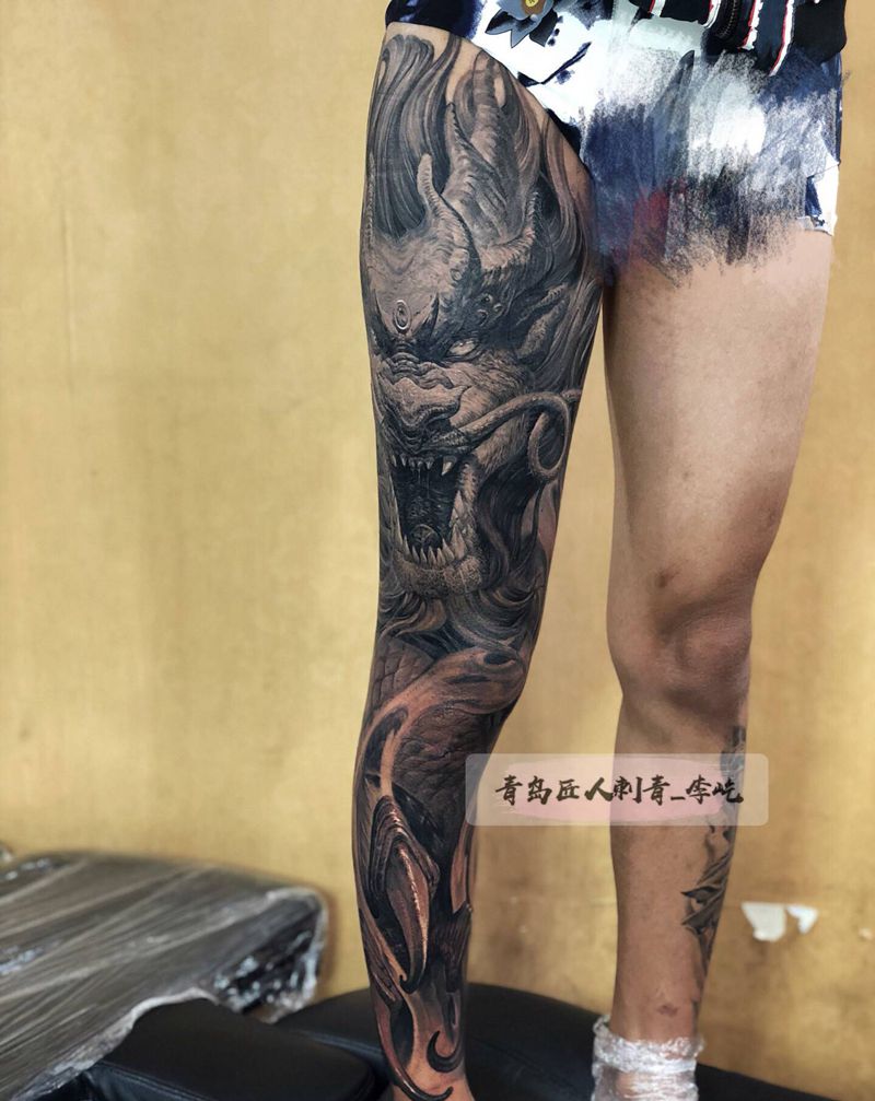 • T网红王老大花腿龙纹身图片_腿部新传统纹身图案