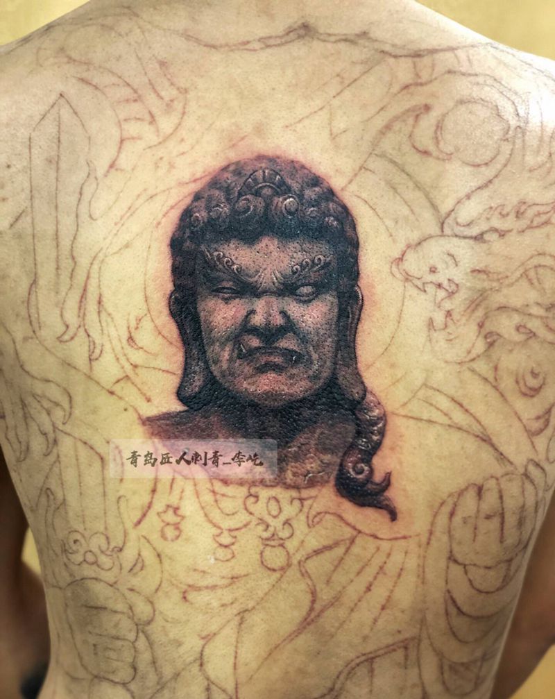 当前位置: 首页 >山东省青岛市纹身店-匠人刺青纹身图案>石雕不动明王纹身图片_背部新传统欧美写实石雕不动明王纹身图案