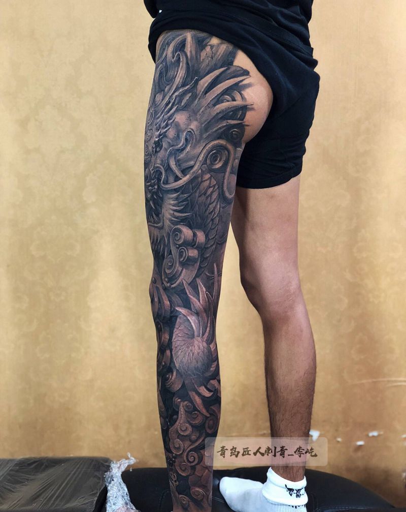 当前位置: 首页 >山东省青岛市纹身店-匠人刺青纹身图案>石雕龙腿纹身图片_腿部新传统欧美写实石雕龙纹身图案