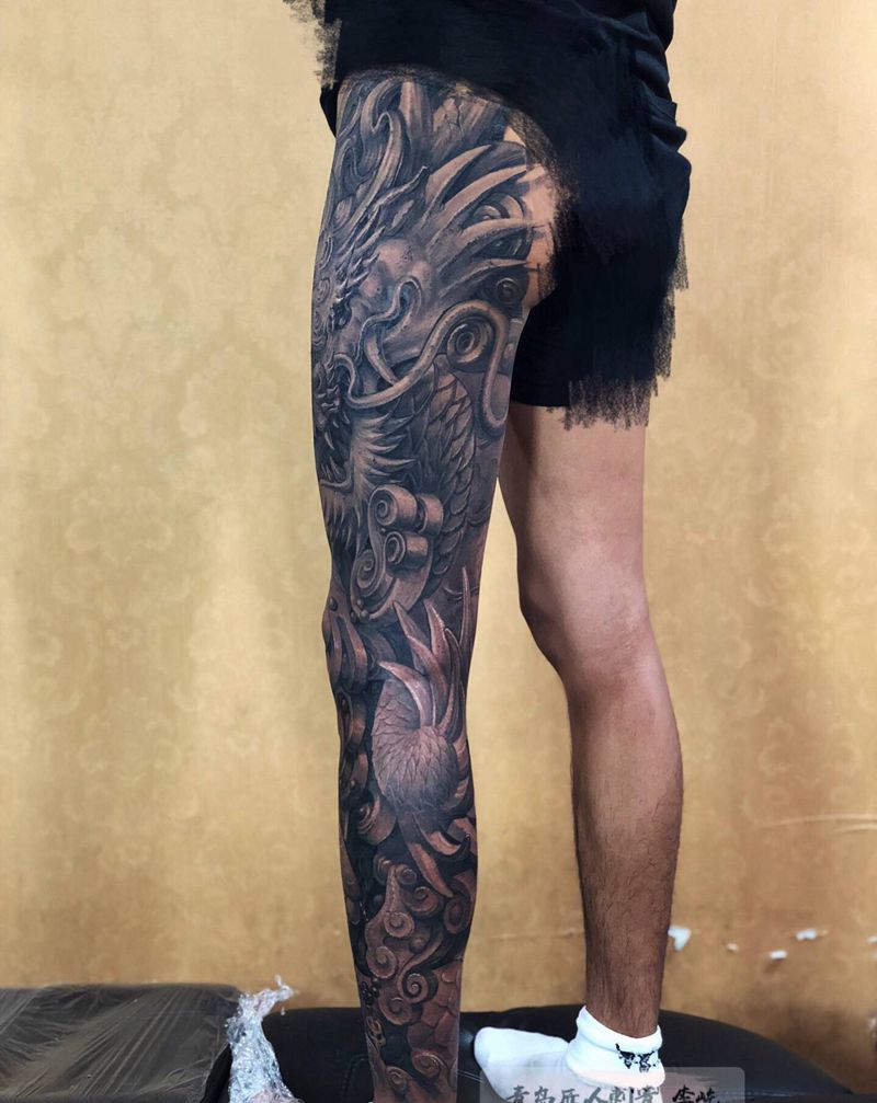 当前位置: 首页 >山东省青岛市纹身店-匠人刺青纹身图案>石雕龙腿纹身图片_腿部新传统欧美写实石雕龙纹身图案