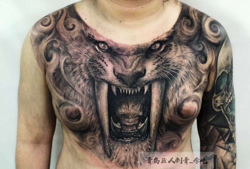 当前位置: 首页 >山东省青岛市纹身店-匠人刺青纹身图案>剑齿虎 花胸纹身图片_胸部欧美写实新传统剑齿虎花胸纹身图案