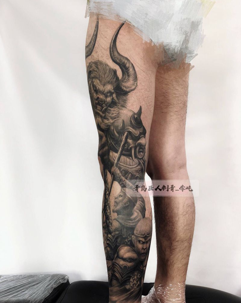 牛魔王花腿未完成纹身图片_腿部新传统欧美写实牛魔王红孩儿纹身图案
