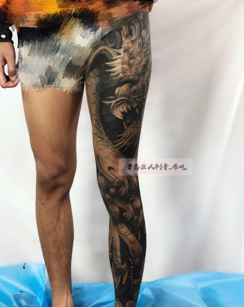 • T网红王老大花腿龙纹身图片_腿部新传统纹身图案