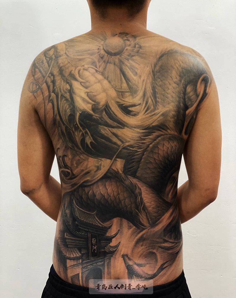 当前位置: 首页 >山东省青岛市纹身店-匠人刺青纹身图案>龙门3纹身图片_背部新传统欧美写实龙龙门鱼跃龙门纹身图案
