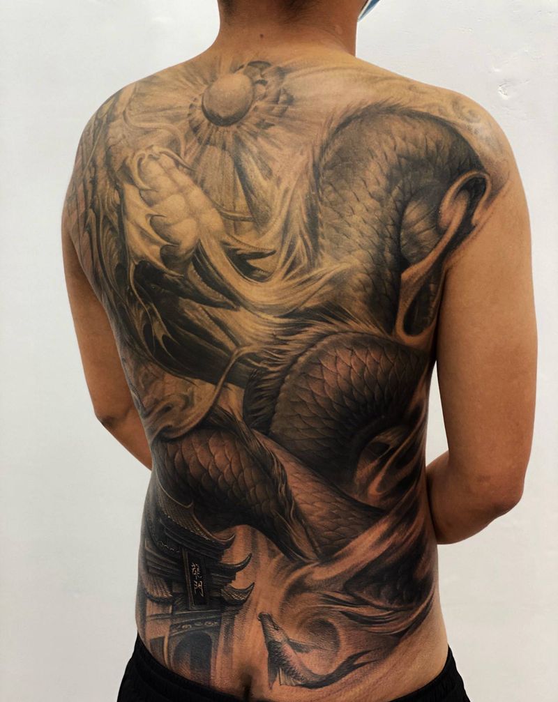龙门3纹身图片_背部新传统欧美写实龙龙门鱼跃龙门纹身图案