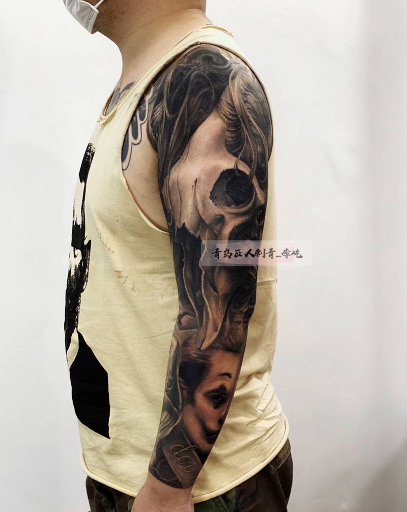 当前位置: 首页 >山东省青岛市纹身店-匠人刺青纹身图案>欧美花臂纹身图片_手臂肩部欧美写实新传统欧美羊小丑纹身图案
