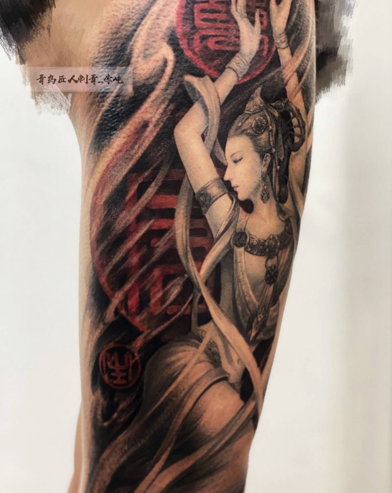 当前位置: 首页 >山东省青岛市纹身店-匠人刺青纹身图案>飞天 八部天龙 乾闼婆纹身图片_腿部欧美写实新传统飞天纹身图案