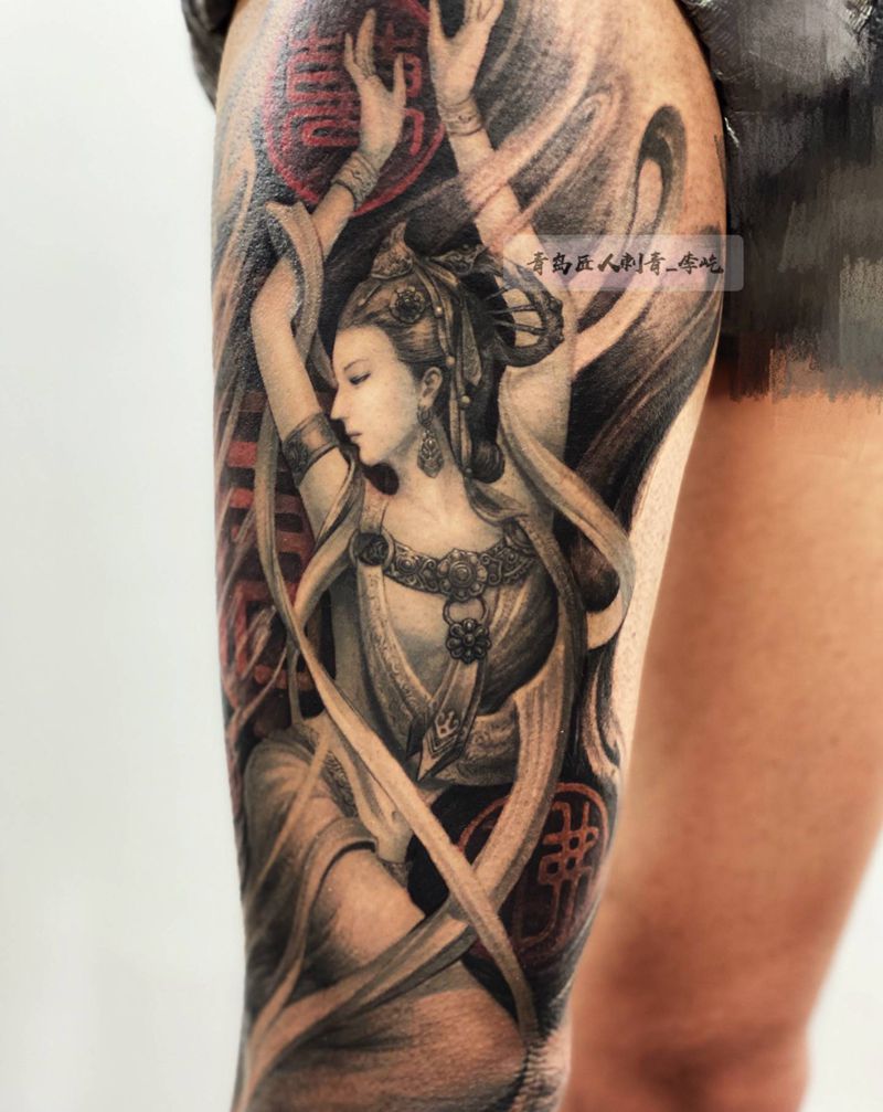飞天 八部天龙 乾闼婆纹身图片_腿部欧美写实新传统飞天纹身图案
