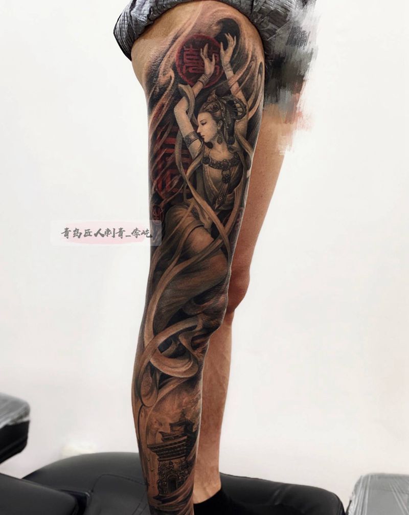 飞天 八部天龙 乾闼婆纹身图片_腿部欧美写实新传统飞天纹身图案