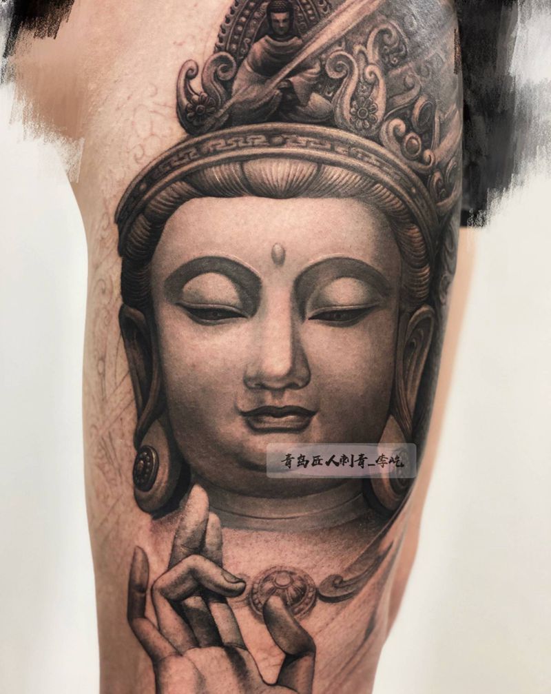 石雕 菩萨 未完成纹身图片_腿部新传统欧美写实菩萨石雕纹身图案