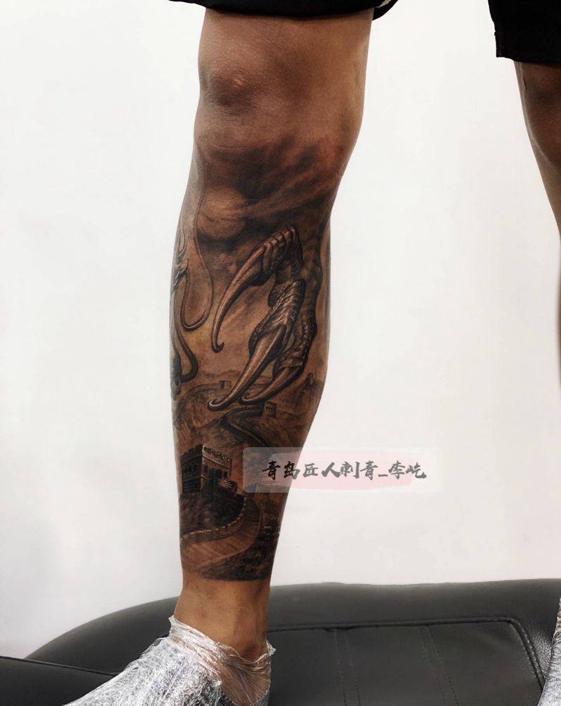 当前位置: 首页 >山东省青岛市纹身店-匠人刺青纹身图案>小腿龙游华夏纹身图片_腿部新传统欧美写实龙游华夏纹身图案