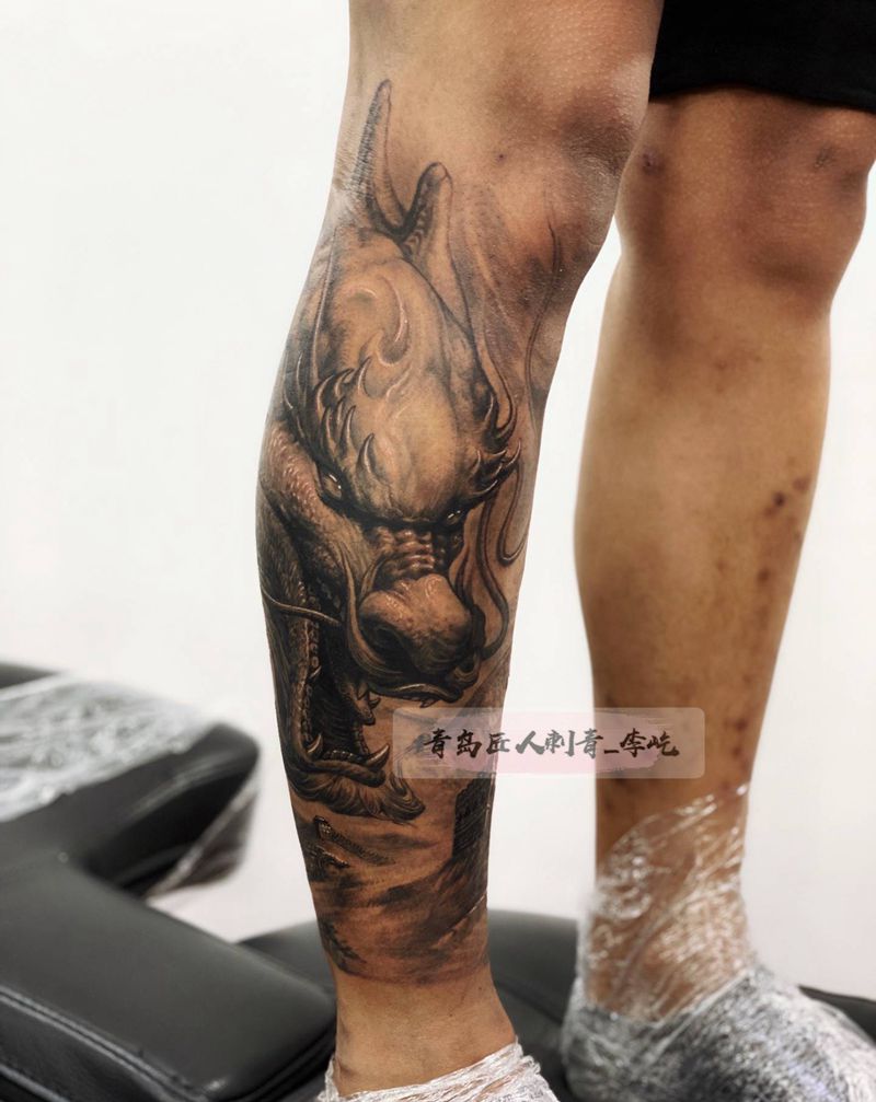 当前位置: 首页 >山东省青岛市纹身店-匠人刺青纹身图案>小腿龙游华夏纹身图片_腿部新传统欧美写实龙游华夏纹身图案