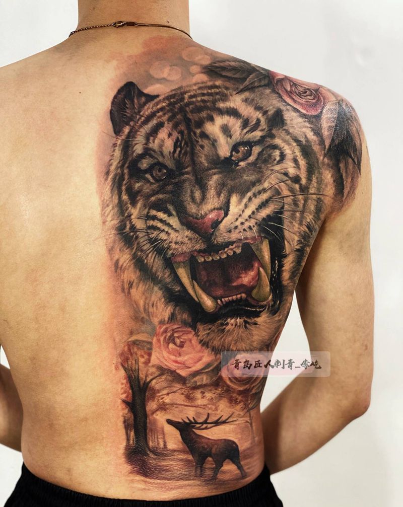 半背 虎头纹身图片_背部欧美写实新传统虎鹿背纹身图案