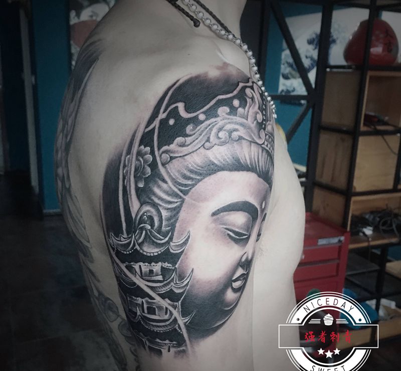 佛头纹身图片_肩部新传统强者刺青纹身图案
