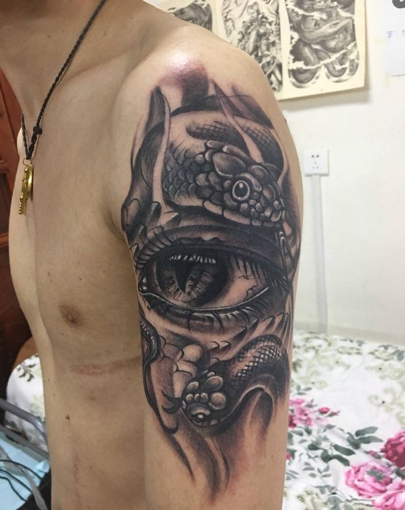 当前位置: 首页 >山东省青岛市纹身店-九纹龙刺青纹身图案>眼睛与蛇纹身图片_成品手臂肩部写实清新欧美动物纹身图案
