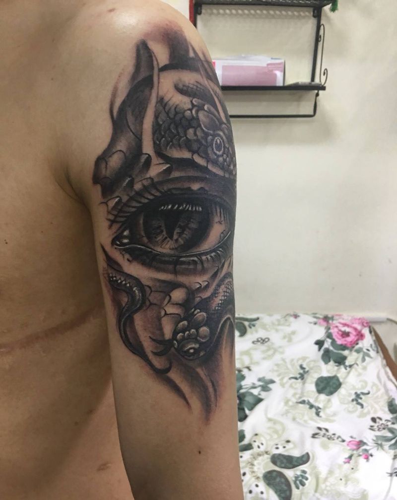当前位置: 首页 >山东省青岛市纹身店-九纹龙刺青纹身图案>眼睛与蛇纹身图片_成品手臂肩部写实清新欧美动物纹身图案