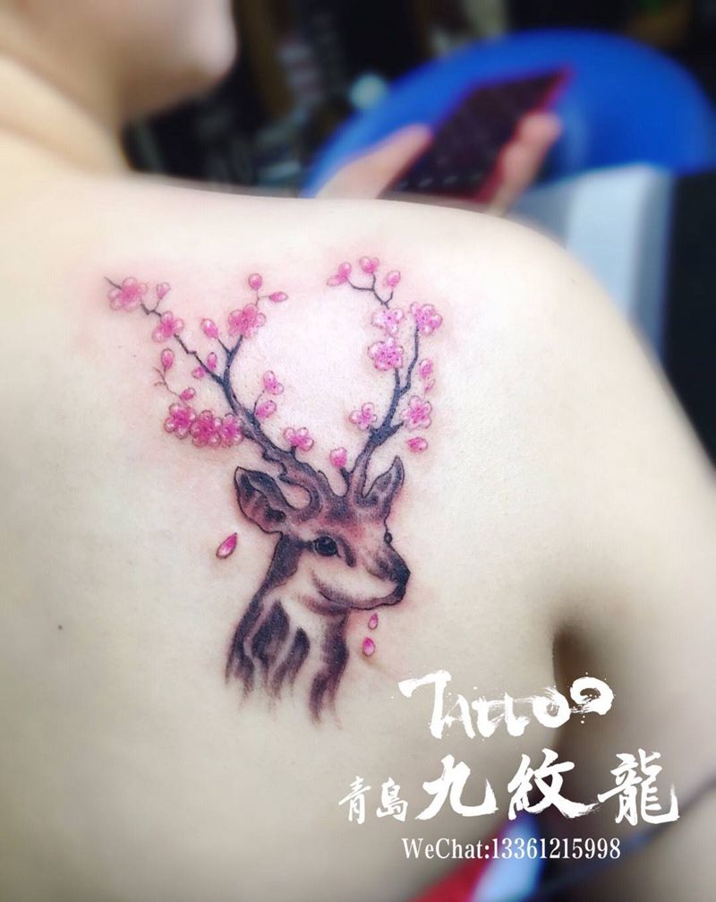 当前位置: 首页 >山东省青岛市纹身店-九纹龙刺青纹身图案>鹿头纹身图片_成品肩部背部清新写实动物贴纸纹身图案