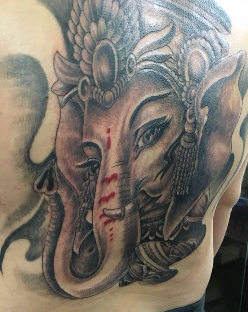 当前位置: 首页 >山东省青岛市纹身店-九纹龙刺青纹身图案>象神纹身图片_成品背部写实宗教纹身图案