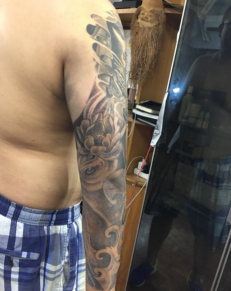 当前位置: 首页 >山东省青岛市纹身店-九纹龙刺青纹身图案>鲤鱼佛头花臂纹身图片
