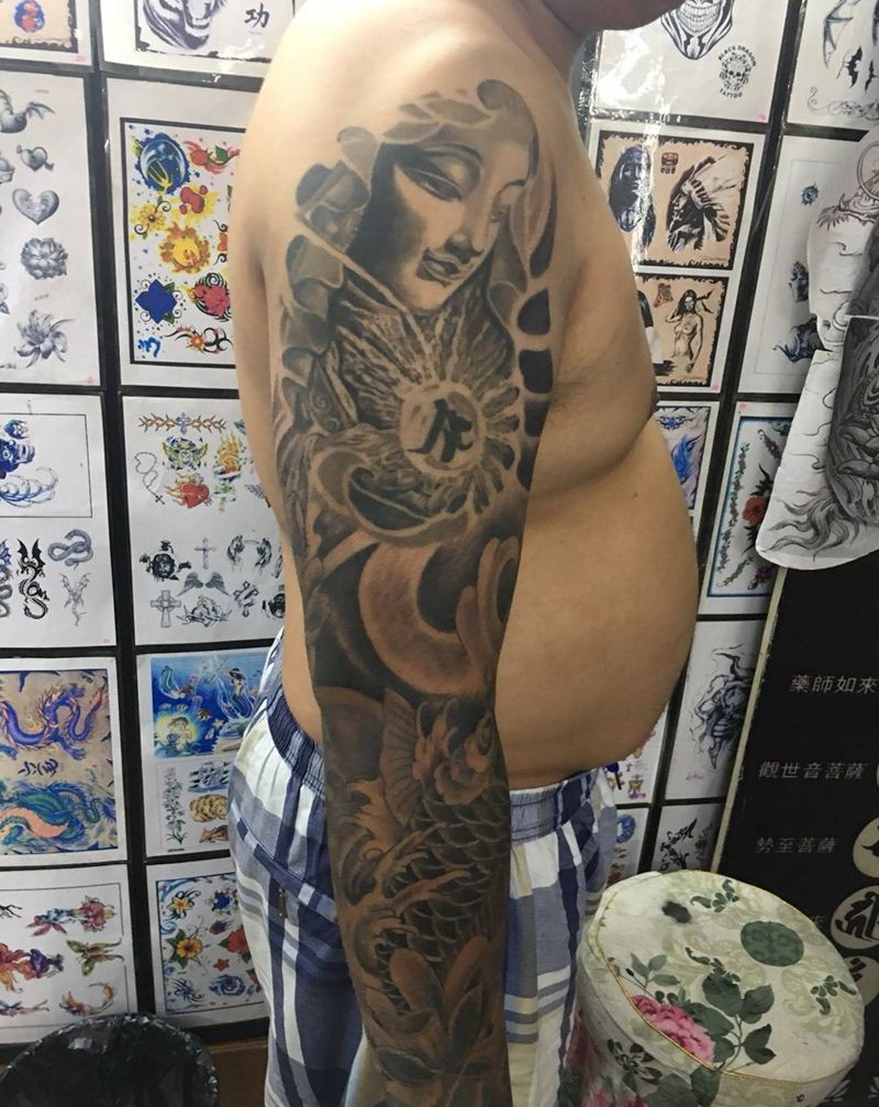 当前位置: 首页 >山东省青岛市纹身店-九纹龙刺青纹身图案>鲤鱼佛头花臂纹身图片