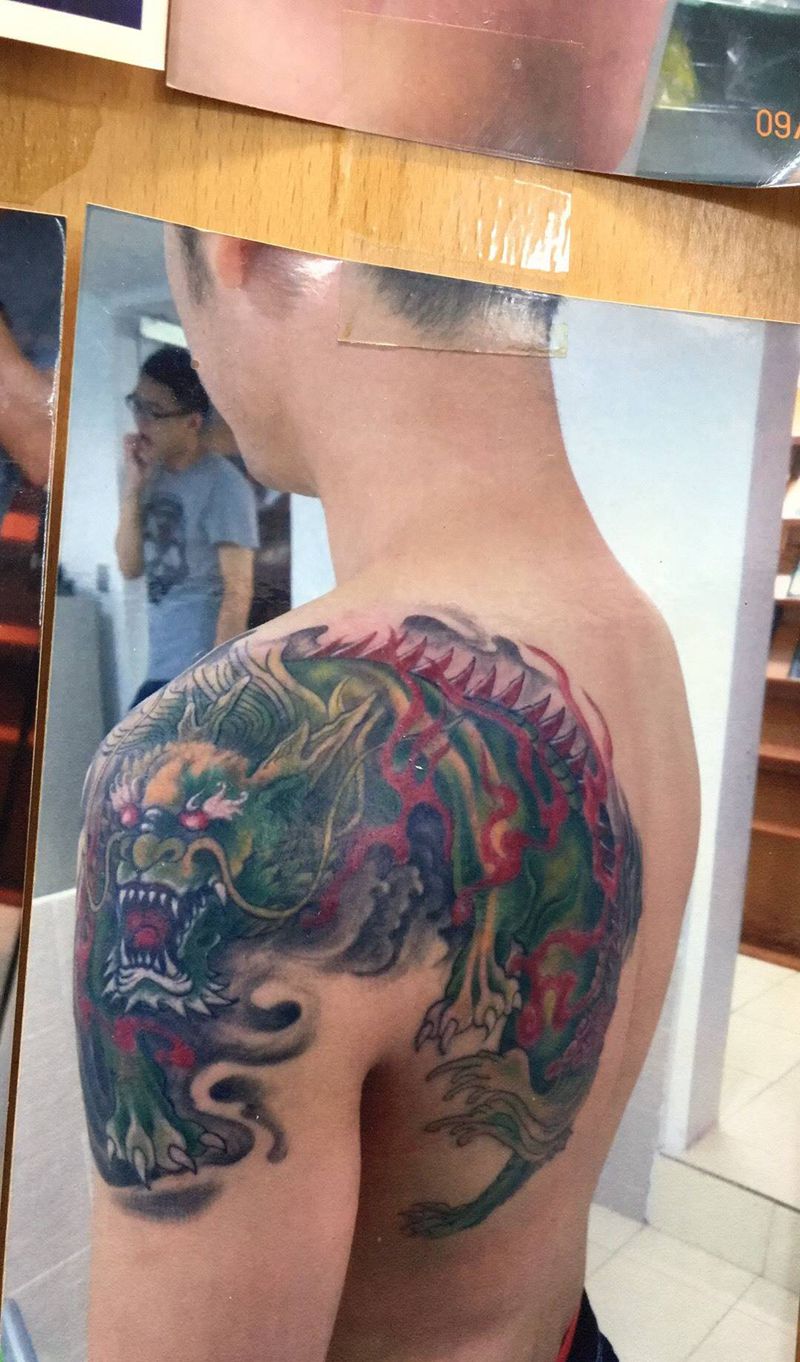 当前位置: 首页 >山东省青岛市纹身店-九纹龙刺青纹身图案>上臂火麒麟纹身图片
