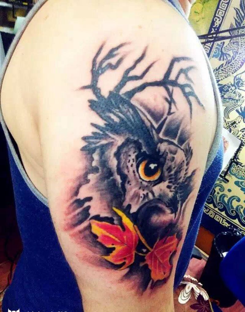 当前位置: 首页 >山东省青岛市纹身店-九纹龙刺青纹身图案>上臂猫头鹰纹身图片