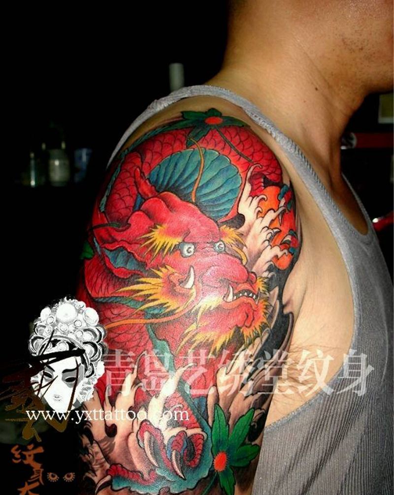 • T网红王老大花腿龙纹身图片_腿部新传统纹身图案