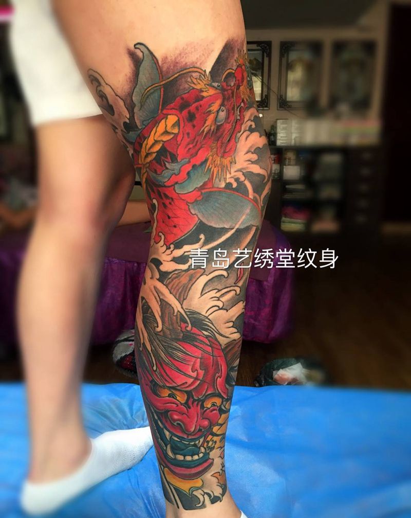 • T网红王老大花腿龙纹身图片_腿部新传统纹身图案