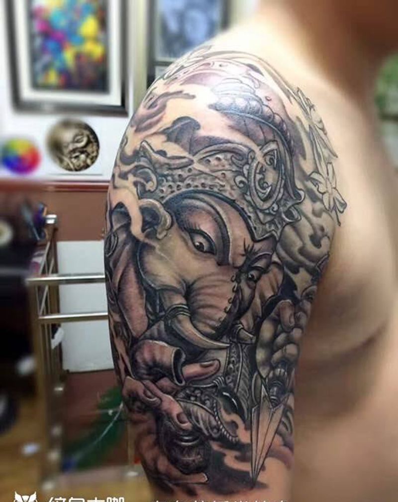 当前位置: 首页 >山东省青岛市纹身店-青岛艺绣堂纹身纹身图案>象神纹身图片_成品手稿动物写实纹身图案