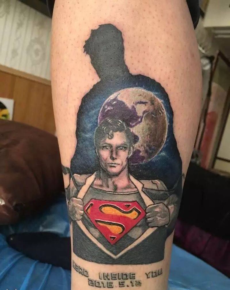 当前位置: 首页 >山东省青岛市纹身店-青岛艺绣堂纹身纹身图案>超人纹身图片_成品原创写实腿部纹身图案