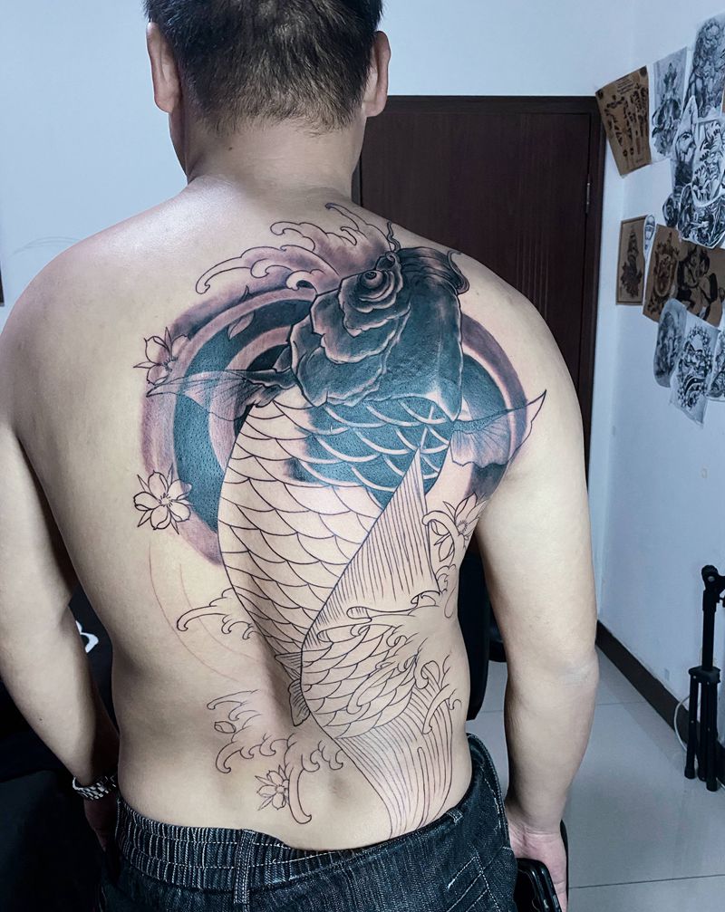 当前位置: 首页 >山东省青岛市纹身店-青城刺青纹身图案>半背鲤鱼纹身遮盖旧纹身纹身图片_背部老传统新传统纹身图案