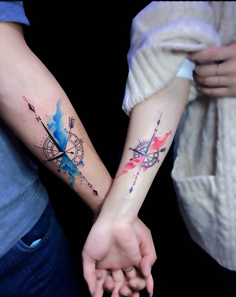当前位置: 首页 >山东省青岛市纹身店-青城刺青纹身图案>情侣纹身 指南针纹身纹身图片_手臂水彩几何纹身图案