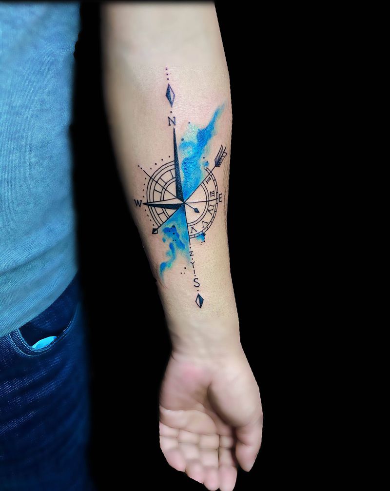 当前位置: 首页 >山东省青岛市纹身店-青城刺青纹身图案>情侣纹身 指南针纹身纹身图片_手臂水彩几何纹身图案