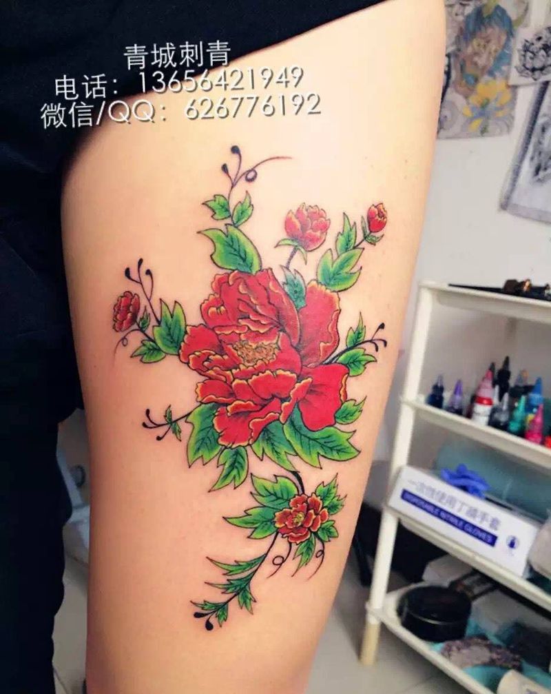 当前位置: 首页 >山东省青岛市纹身店-青城刺青纹身图案>牡丹纹身图片_腿部成品传统植物原创纹身图案