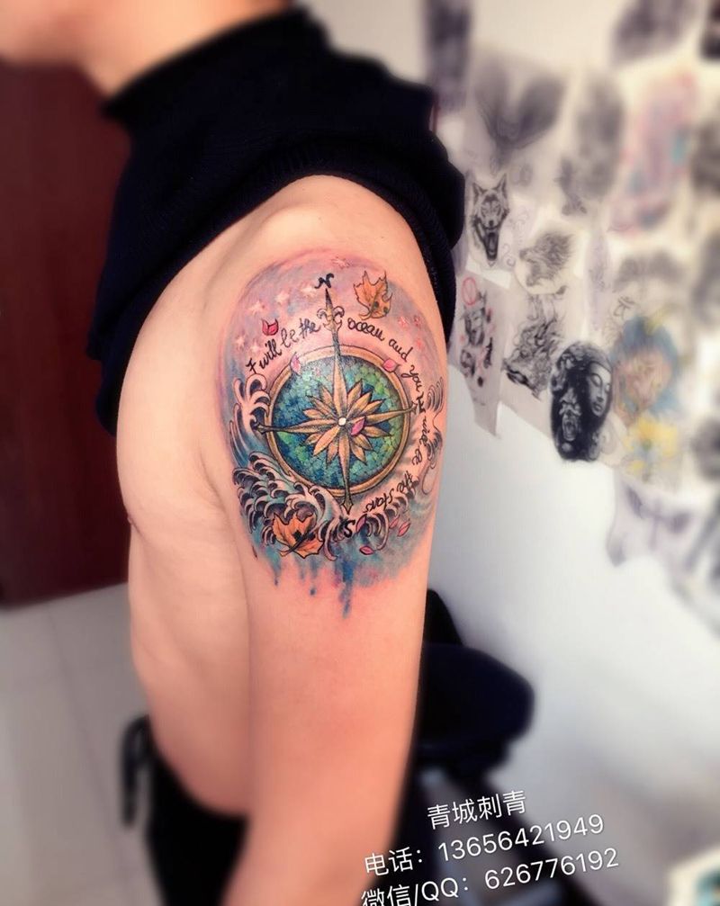当前位置: 首页 >山东省青岛市纹身店-青城刺青纹身图案>水彩泼墨指南针纹身图片_成品手臂传统清新几何静物原创字符纹身图案