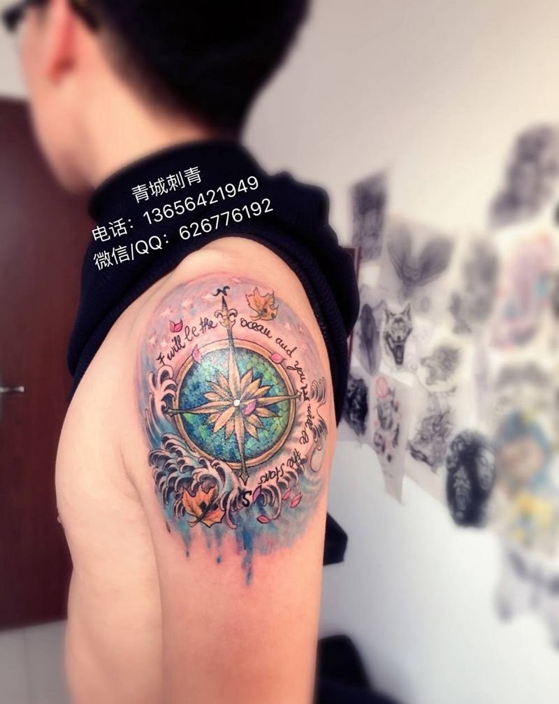 当前位置: 首页 >山东省青岛市纹身店-青城刺青纹身图案>水彩泼墨指南针纹身图片_成品手臂传统清新几何静物原创字符纹身图案