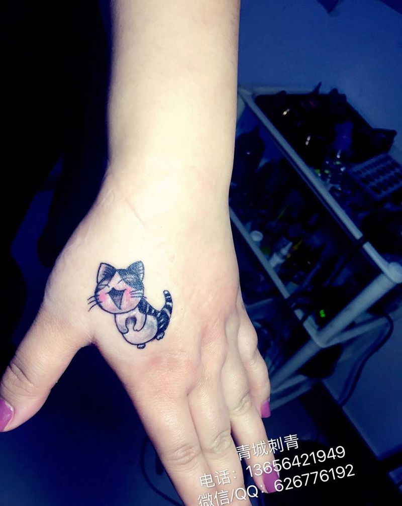猫咪纹身纹身图片_成品手部传统清新动物纹身图案