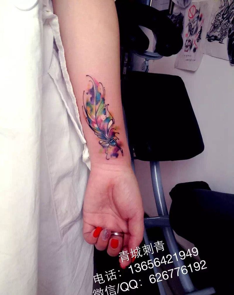 当前位置: 首页 >山东省青岛市纹身店-青城刺青纹身图案>水彩羽毛纹身纹身图片_成品手臂清新欧美静物纹身图案