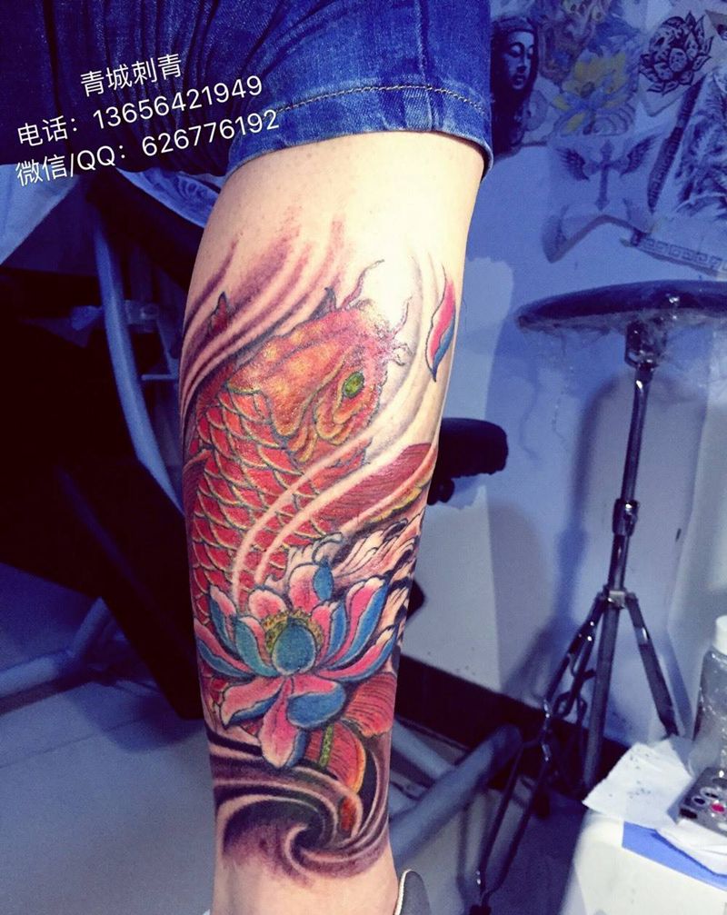 小腿鲤鱼 彩色鲤鱼纹身纹身图片_成品腿部传统动物原创纹身图案