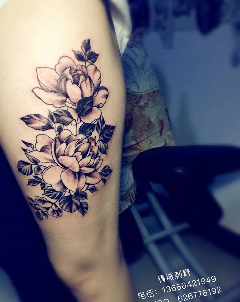 美女大腿花朵纹身纹身图片_成品腿部清新传统植物原创纹身图案