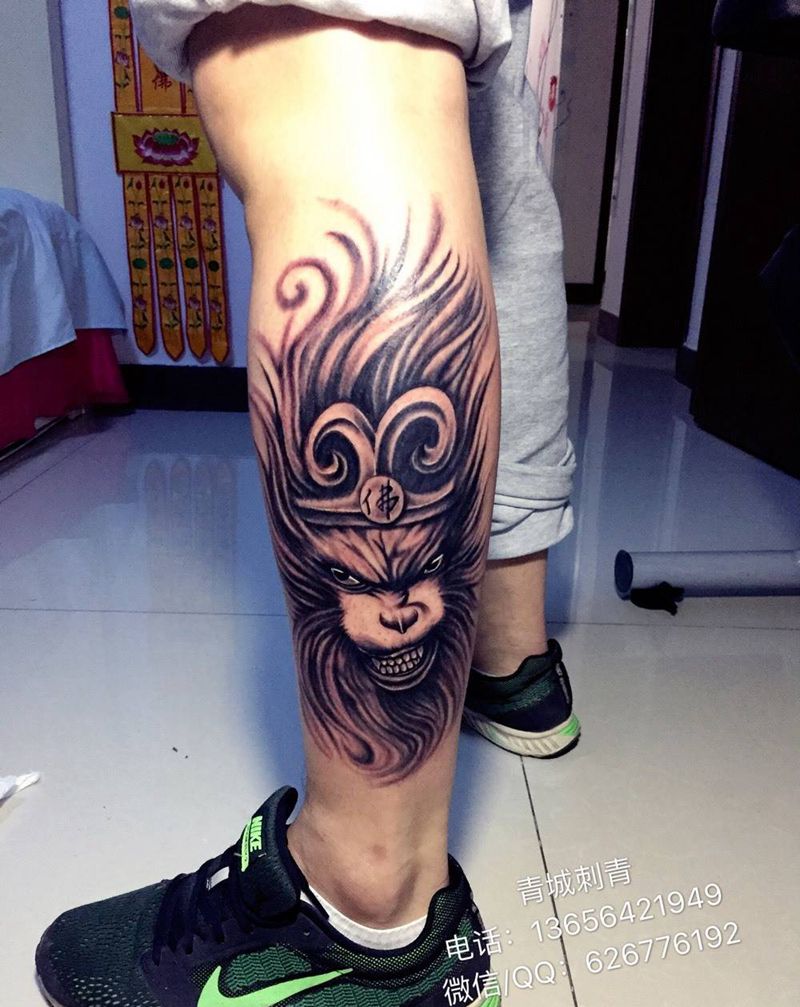 当前位置: 首页 >山东省青岛市纹身店-青城刺青纹身图案>斗战胜佛 包小腿一侧纹身图片_成品腿部传统人物鬼神纹身图案
