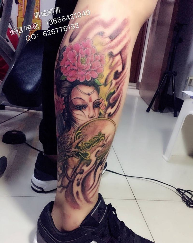 当前位置: 首页 >山东省青岛市纹身店-青城刺青纹身图案>艺妓纹身纹身图片_成品腿部传统人物纹身图案