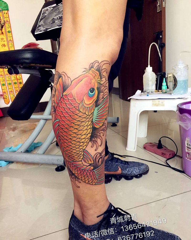 彩色鲤鱼纹身 青岛即墨纹身图片_成品腿部传统动物纹身图案