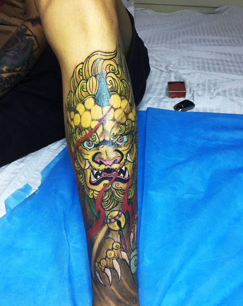 当前位置: 首页 >山东省青岛市纹身店-青城刺青纹身图案>唐狮纹身纹身图片_腿部老传统纹身图案