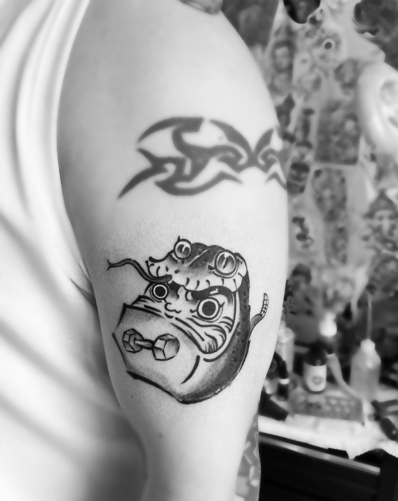 当前位置: 首页 >山东省青岛市纹身店-青城刺青纹身图案>达摩蛋纹身杠铃纹身纹身图片_手臂新传统老传统纹身图案