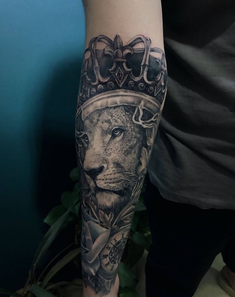写实狮子遮盖纹身图片_手臂欧美写实纹身图案