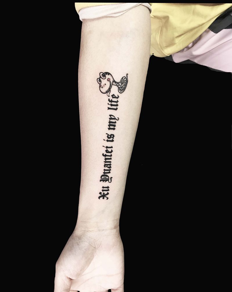当前位置: 首页 >山东省青岛市纹身店-青城刺青纹身图案>情侣纹身 独角兽 蛇纹身纹身图片_手臂花体字新传统纹身图案