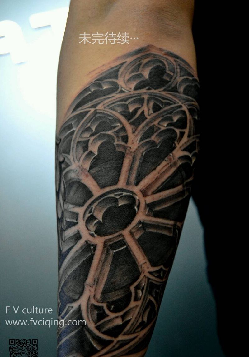 当前位置: 首页 >山东省青岛市纹身店-FV 纹身 艺术区纹身图案>欧美小臂,建筑风格,教堂窗花纹身图片