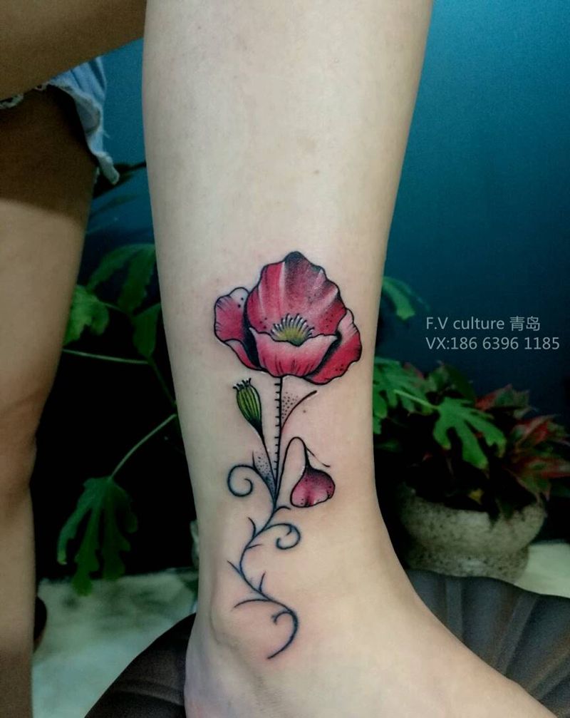 适合女孩脚腕的小清新罂粟花纹身纹身图片_腿部脚部欧美清新植物青岛FV成品纹身图案
